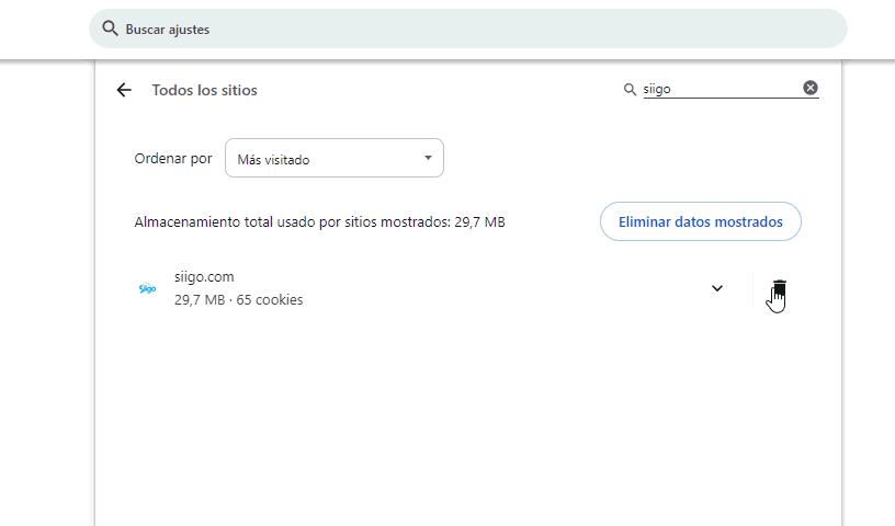 5. De este modo, aparecerá el listado de todos los sitios que han almacenado cookies. Es necesario que utilices el buscador para seleccionar solamente las cookies de Siigo y posteriormente das clic sobre el ícono de eliminar