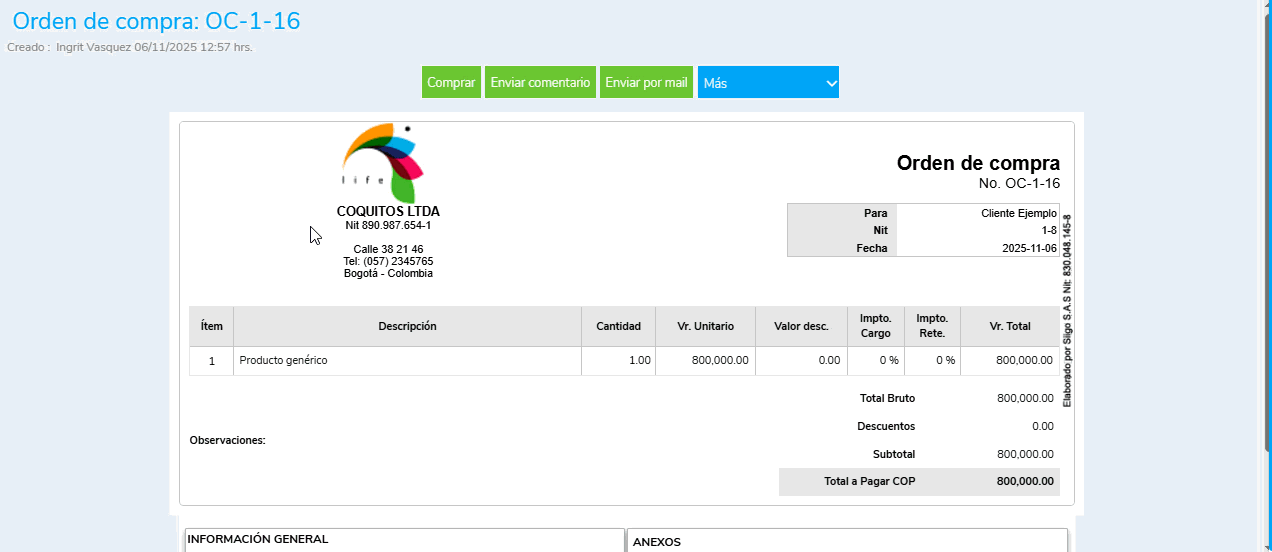 . - Para visualizar la orden de compra, haz clic sobre el número del comprobante.