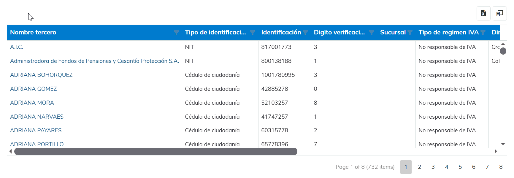 La búsqueda avanzada de terceros te permite consultar información detallada sobre ellos, así como personalizar los datos que se muestran. Estos terceros pueden ser clientes, proveedores u otros.