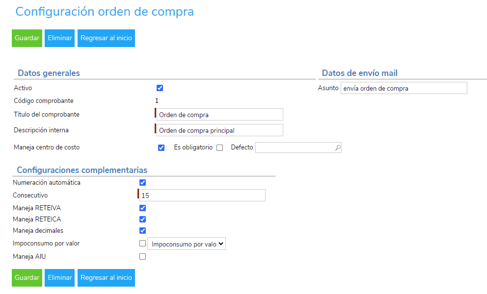 3. Datos de envío mail: en esta casilla se define el asunto que será visible al momento de enviar la orden de compra por correo electrónico.