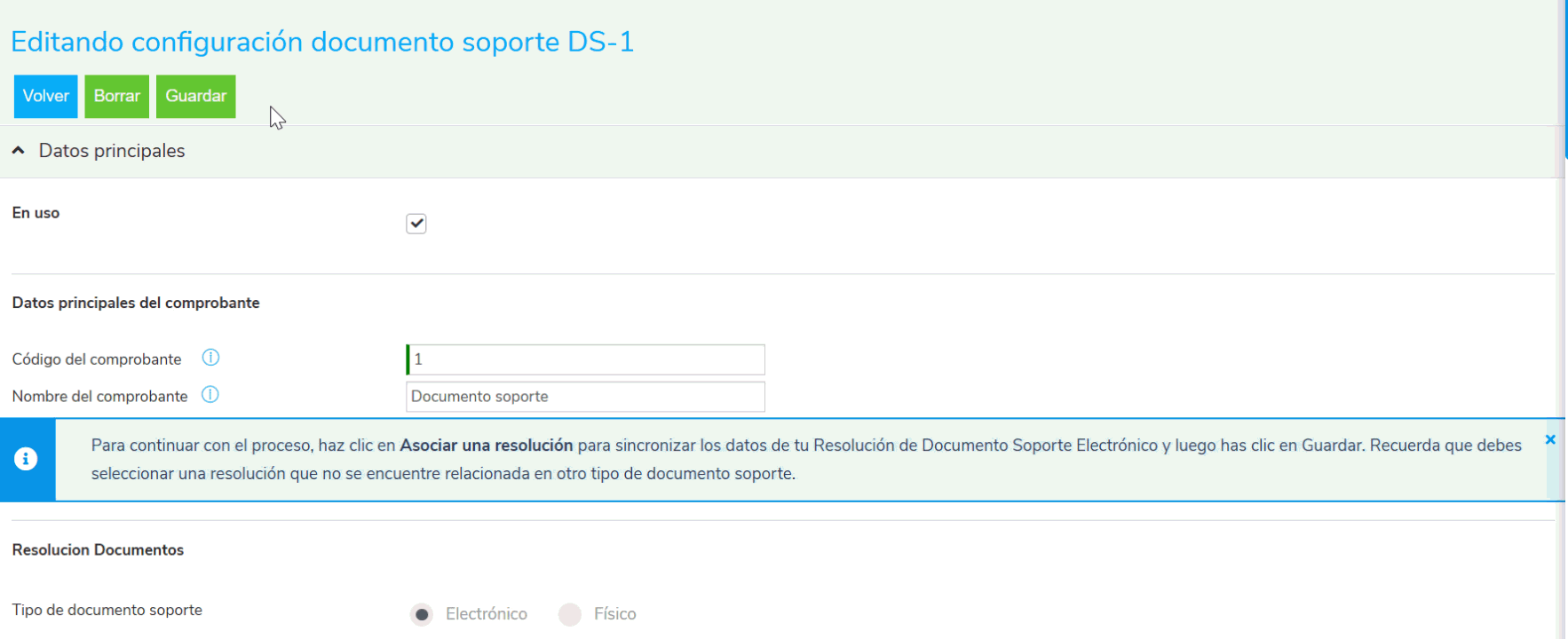 Importante: visualizarás un mensaje que aclara la necesidad de manejar una resolución por cada tipo de documento soporte.