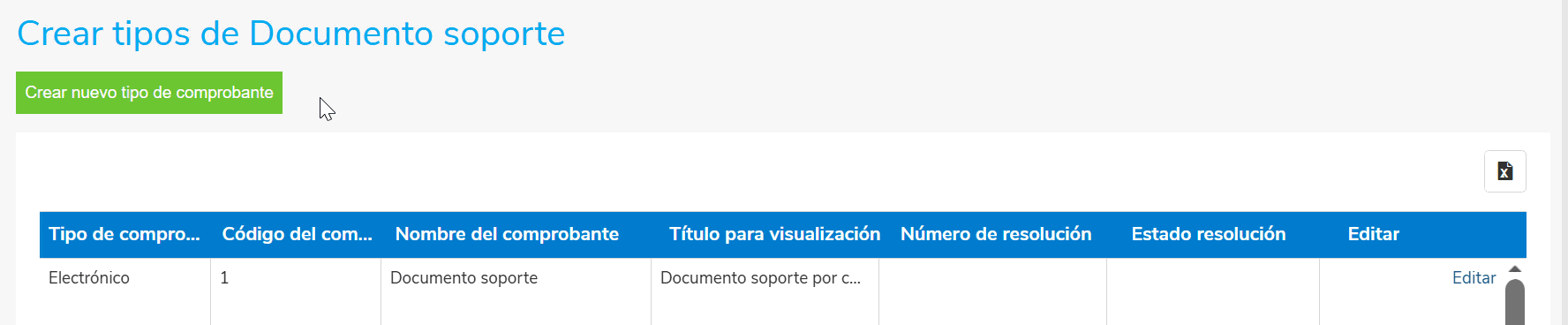- Crear un nuevo tipo de comprobante de Documento soporte, presionando el botón Crear nuevo tipo de comprobante