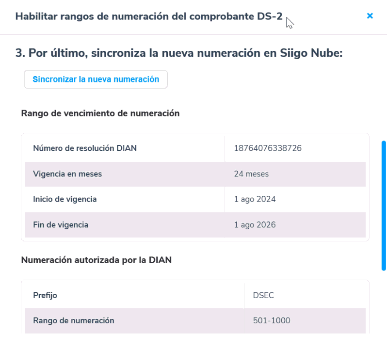 Por último, asocias la nueva resolución a tu comprobante de documento soporte, para ello es necesario que hagas clic en el botón Sincronizar la nueva numeración