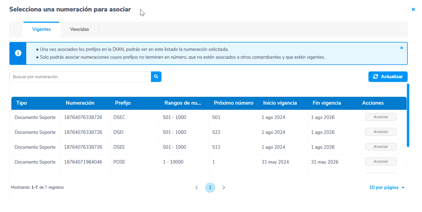 Importante: Recuerda que solo podrás asociar numeraciones, donde el prefijo no termine en número, que la resolución no este asociada a otro comprobante y que este vigente.