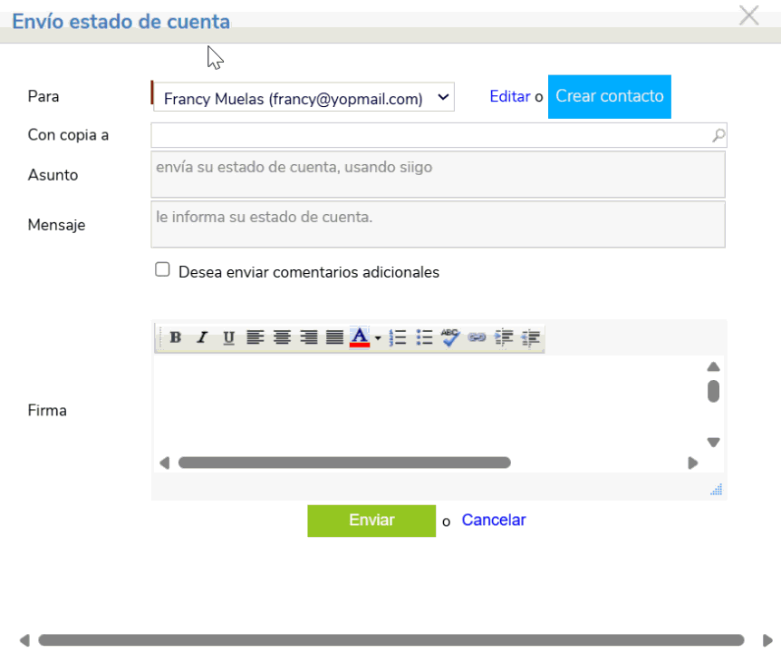 : esta función te permite enviar el estado de cuenta al cliente por correo electrónico. En esta ventana confirma los datos del contacto y correo al cual se enviará la información y si deseas podrás enviarlo a más correos, adicionándolos en el campo “Con copia a”.