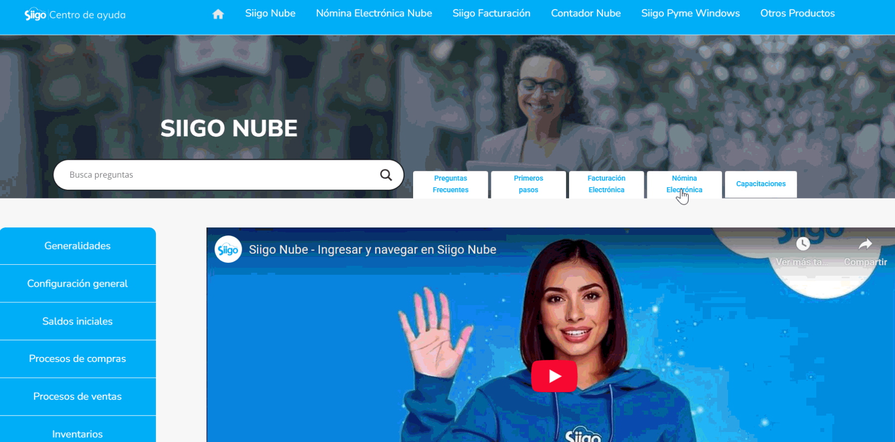 - Primeros pasos: aquí visualizarás varias secciones como: Siigo Nube, nómina electrónica y facturación electrónica desde POS, al ubicarte en cada una de ellas encontrarás vídeos en orden cronológico, para que inicies a configurar tu Siigo.