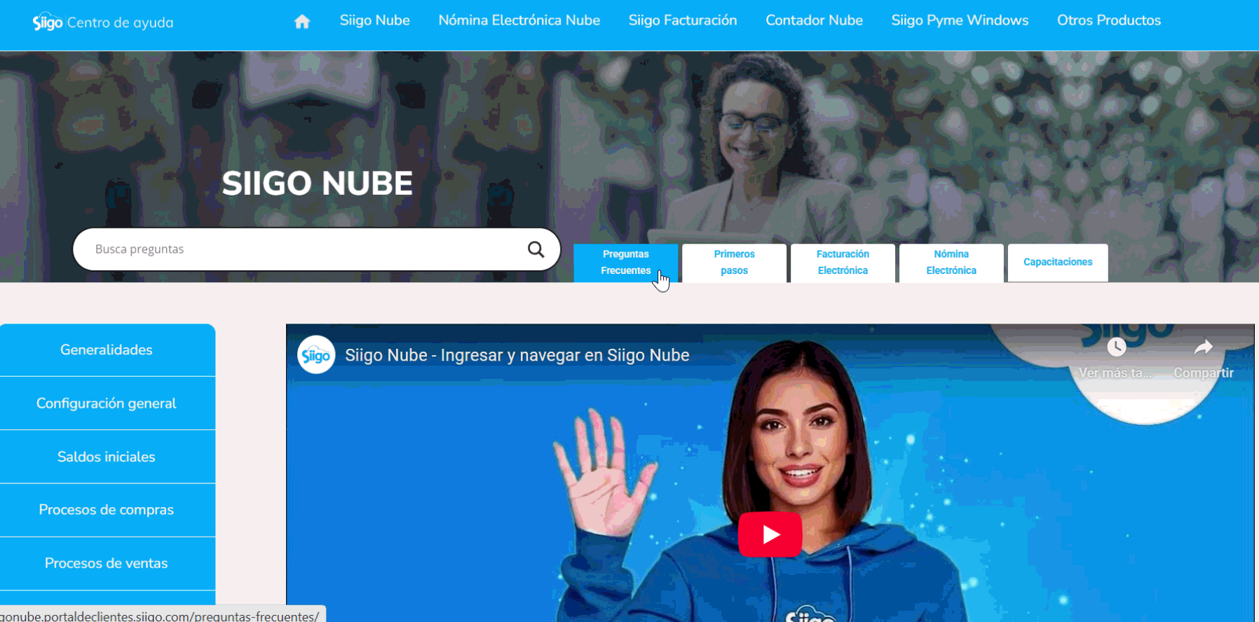 Guías: en la parte lateral izquierda podrás ver los módulos a implementar en tu Siigo Nube, como: generalidades, configuración general, saldos iniciales, proceso de compras, procesos de ventas, entre otros.
