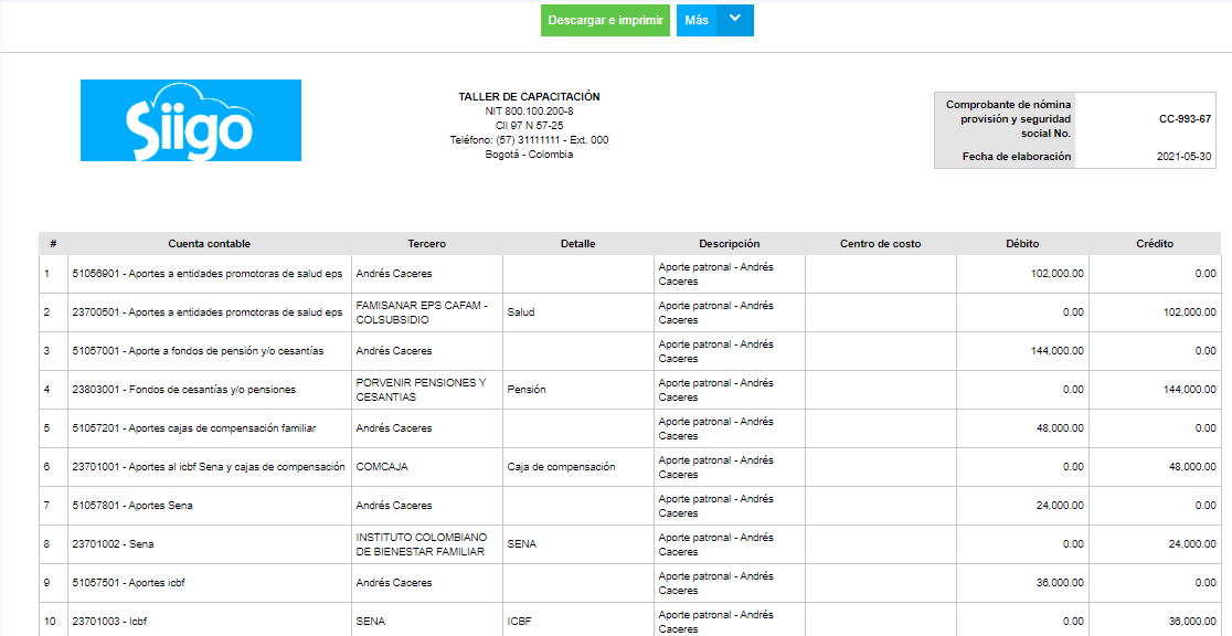 2. Comprobante de nómina, provisión y seguridad social:
