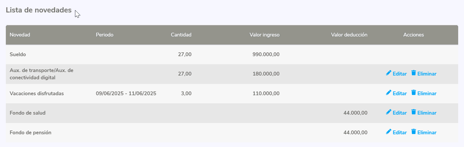Importante: recuerda que es necesario incluir manualmente los conceptos de sueldo, pensión, salud, auxilios y otras novedades con el valor correspondiente.