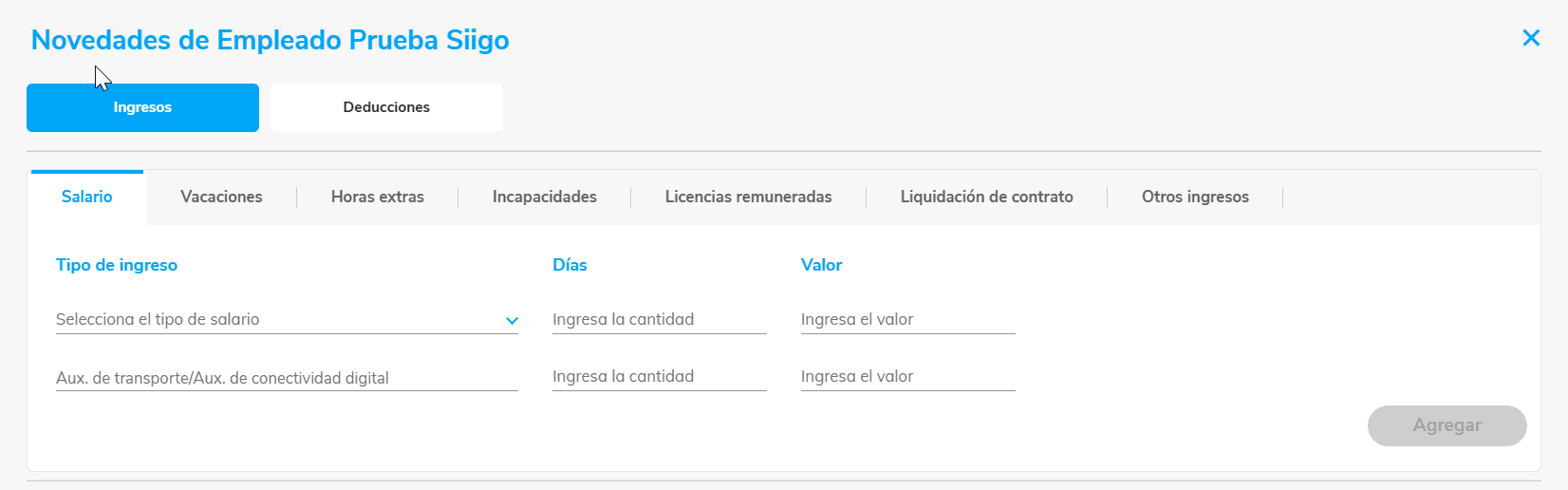 Al ingresar, el sistema te permite relacionar las novedades de ingresos y deducciones, donde seleccionas la pestaña de acuerdo a la novedad, incluyes los datos y seleccionas Agregar