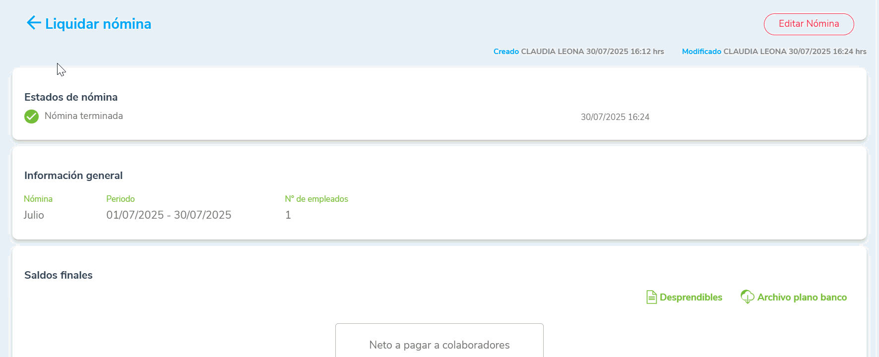8. El sistema te llevará a una pantalla, donde te mostrará la información general de la nómina y los saldos finales (neto a pagar a colaboradores). Puedes seleccionar «Ver detalle», para consultar un informe preciso con los valores.