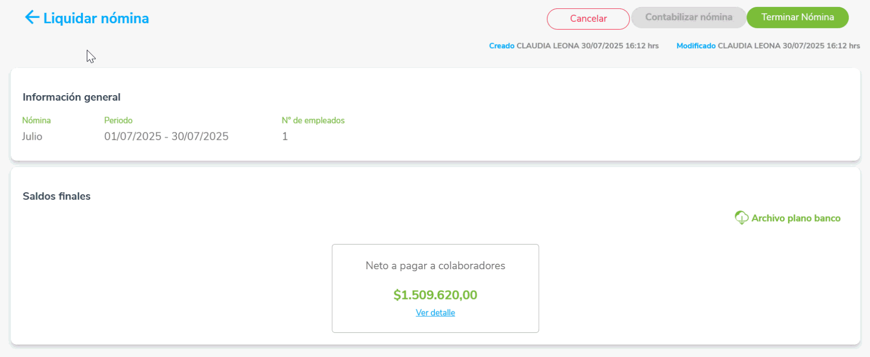 Si confirmas que la información está correcta, selecciona Terminar nómina