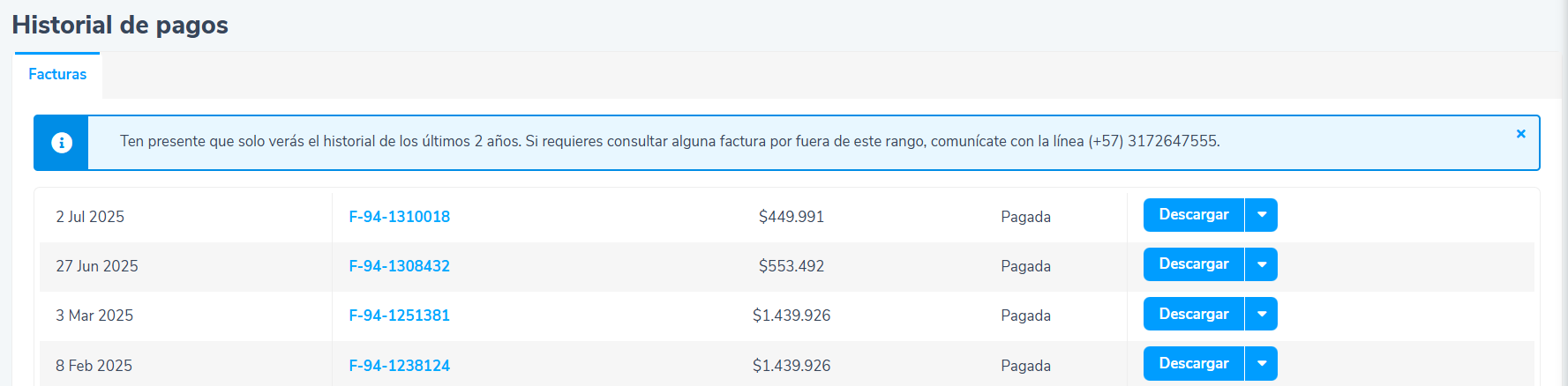 - En la parte inferior vas a poder visualizar el historial de pago, donde encontrarás las facturas que se han generado durante el año, podrás reenviarlas, descargar e imprimir.
