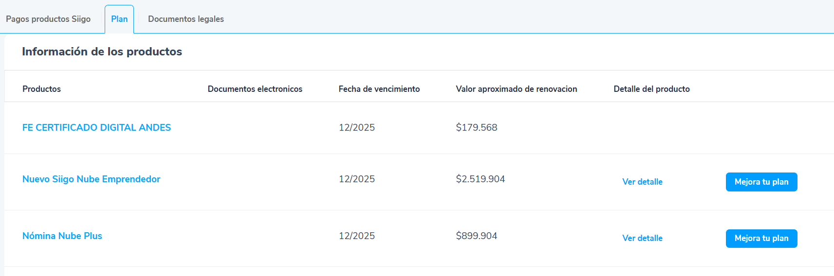 Plan: en esta opción podrás visualizar la información de los productos que tienes actualmente en tu plan, detallando el valor de la próxima renovación y podrás acceder a la tienda si deseas mejorar tu plan.