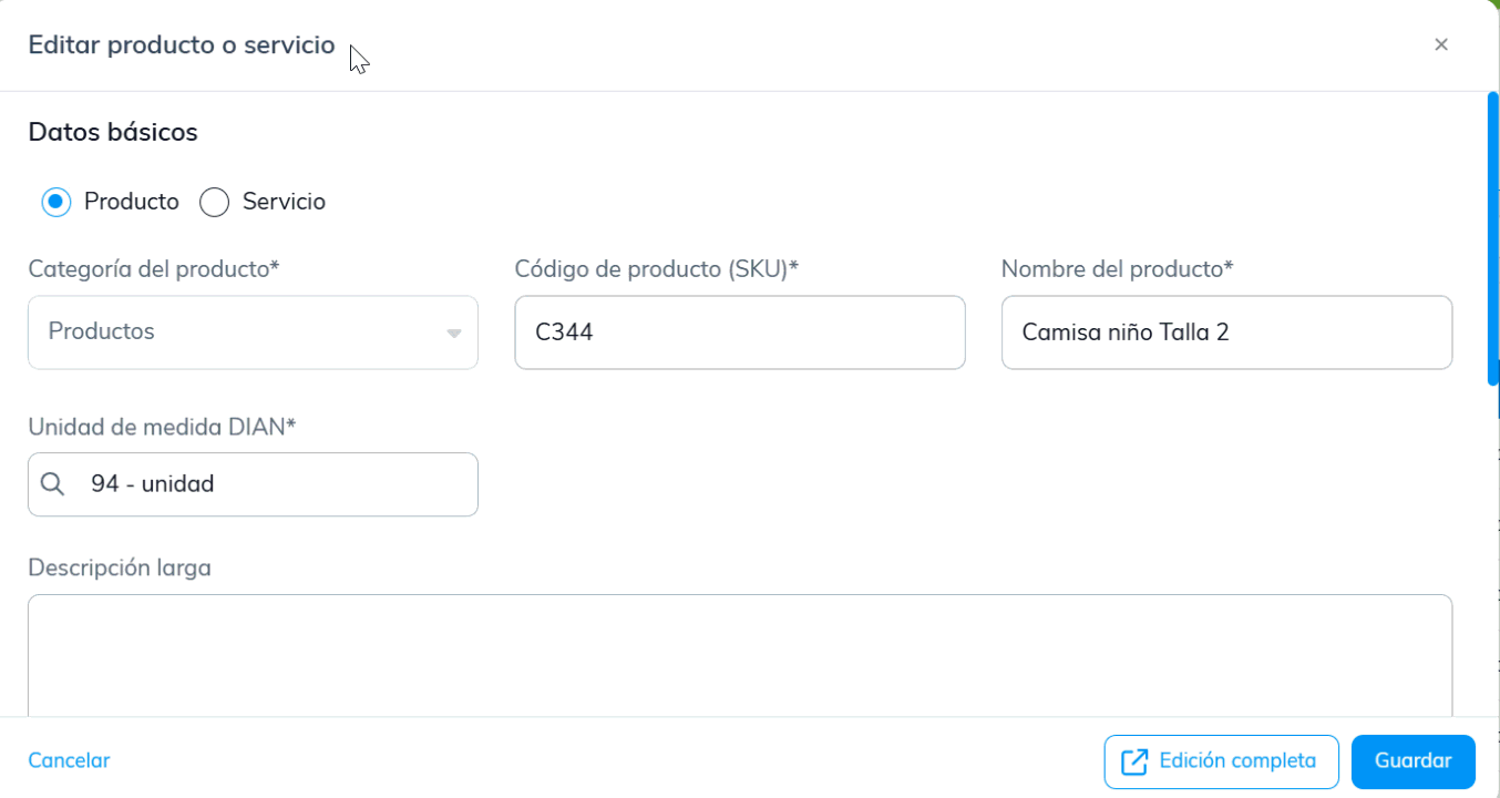 2. Modifica el producto y/o servicio desde la edición rápida.