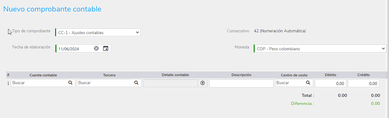 - Débito/Crédito: es necesario digitar el valor de la transacción en la correspondiente columna dependiendo del tipo de registro que se está incorporando.