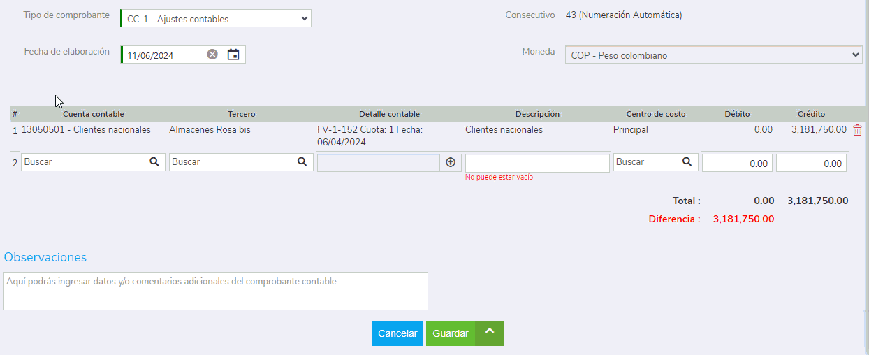 - Fecha de elaboración: eliges la fecha en la cual quedará contabilizado el comprobante contable.