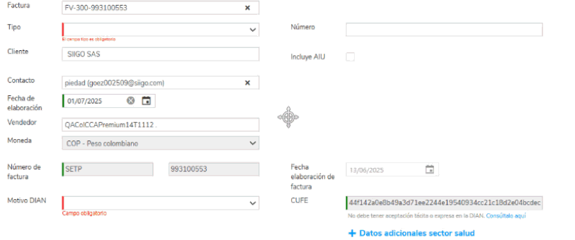 3. Elige la factura electrónica a la que requieres aplicar la nota crédito, el sistema cargará automáticamente los datos y activará el botón + Datos adicionales sector salud