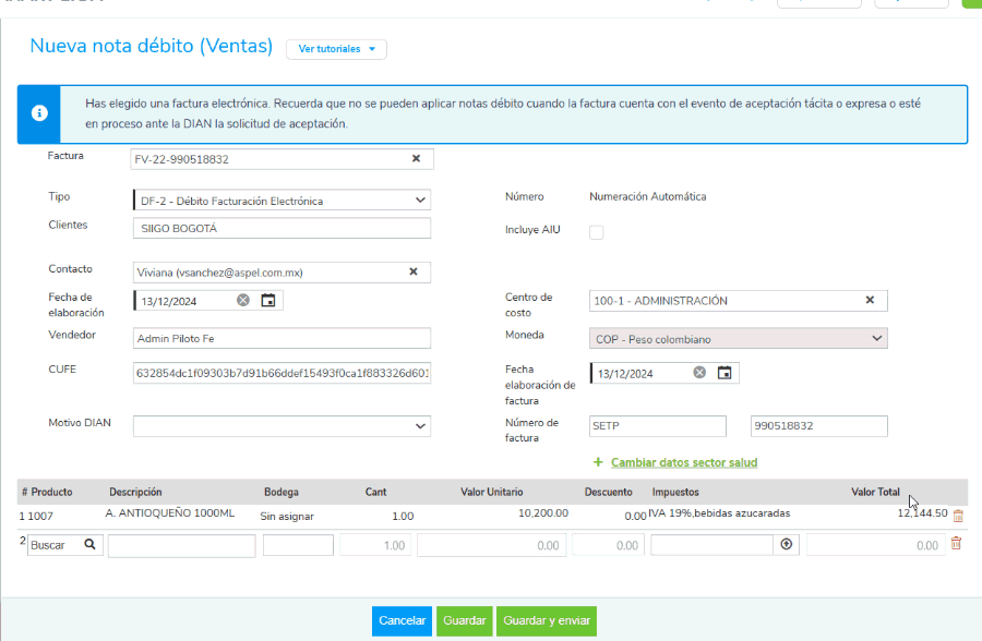 Al hacer una nota débito electrónica con factura de venta asociada, en la vista del documento se mostrará el CUFE de dicha factura.