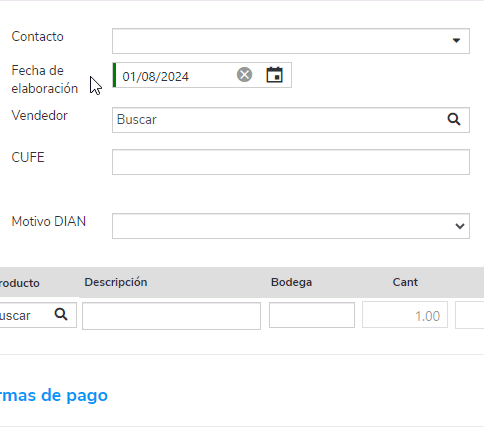 Cuando la selecciones, el sistema trae la información por defecto de los campos Cliente, Contacto, Vendedor, Moneda, CUFE, Fecha elaboración de factura y Número de factura.