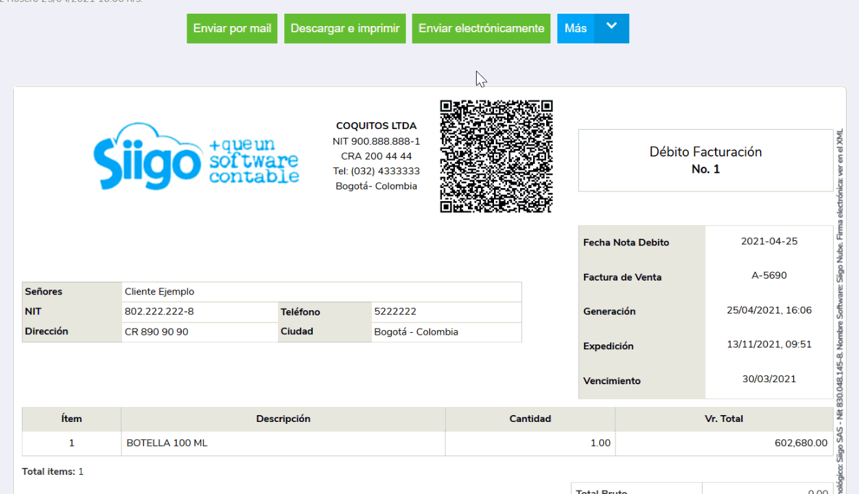 La Nota débito electrónica se envía de manera automática de un correo interno de Siigo ([email protected]) y cuando el cliente la consulta desde el correo electrónico le aparecerá de esta manera: