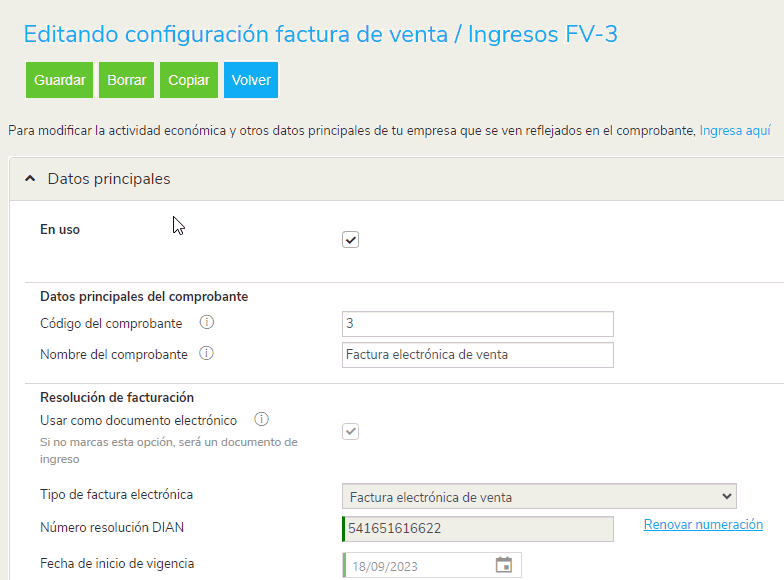 En esta pantalla, es necesario asociar una resolución de facturación diferente. Para hacerlo, ubícate en la sección Datos principales – Resolución de facturación y haz clic en el enlace Renovar numeración.