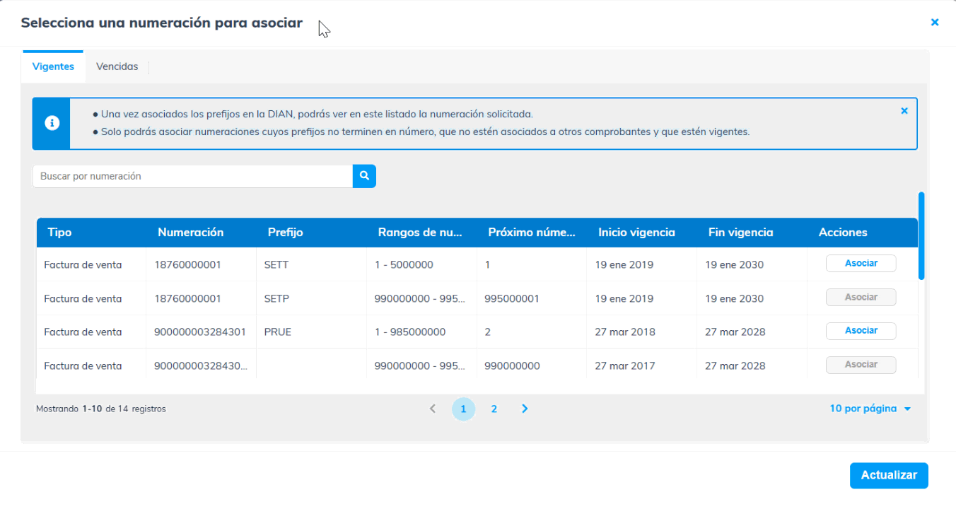 A continuación, se habilita una ventana con el listado de las resoluciones disponibles. En una de ellas, sin importar que esté vencida, haz clic en el botón Asociar