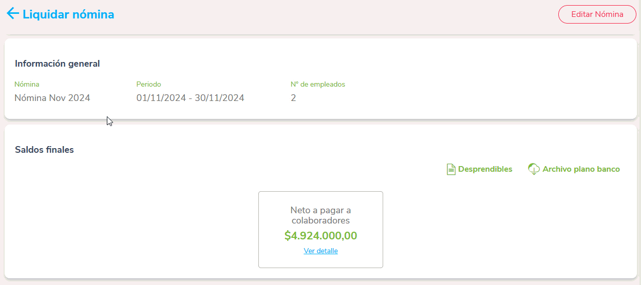 4.Una vez hayas realizado la liquidación de nómina, en Saldos finales das clic en el botón Archivo plano banco