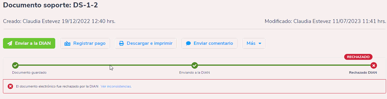 Si al generar el Documento Soporte Electrónico te aparece en estado rechazado, puedes verificar cuál es el error dando clic en el enlace ‘’Ver inconsistencias’’.