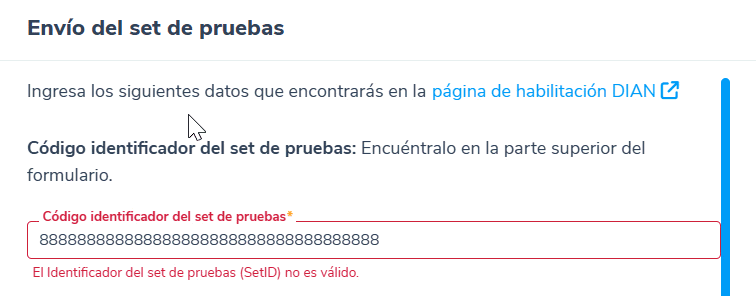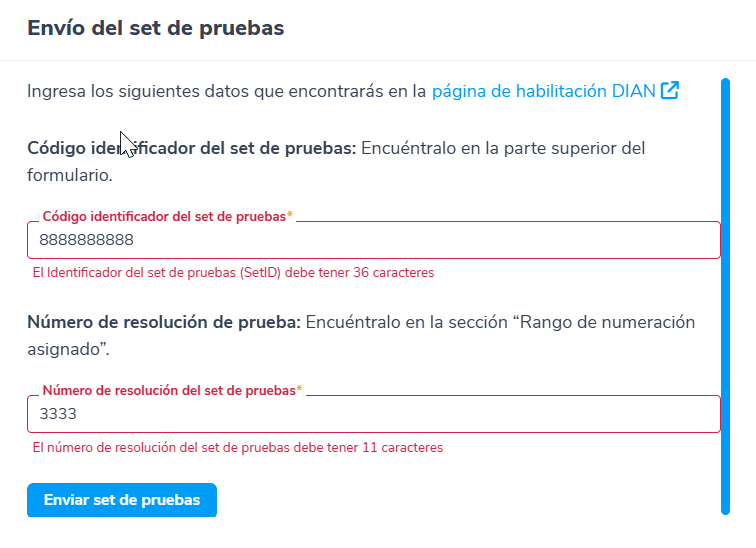 – Error: cuando ocurre un error al enviar el Set de pruebas a la DIAN, te aparecerá un mensaje indicando que el proceso ha fallado, sugiriendo intentar el envío nuevamente.