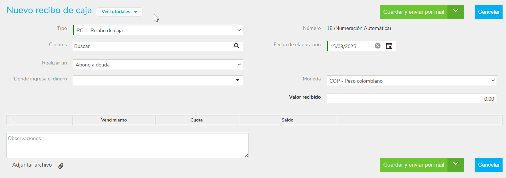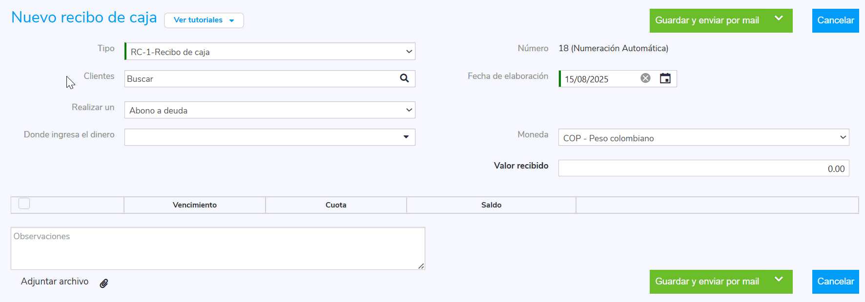 - Adjuntar archivo: el sistema te permite anexar un documento o soporte del recibo de caja (Ejemplo. Documento escaneado con la consignación por el cliente).