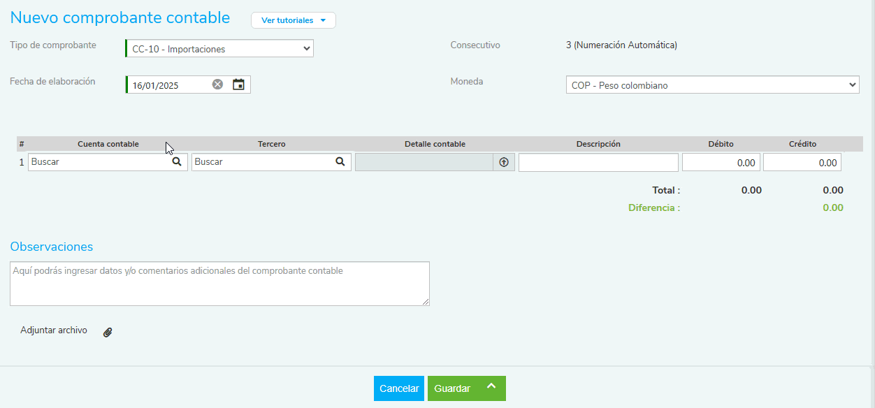 Importante: si no has creado un comprobante para importaciones, puedes hacerlo en la configuración de comprobantes contables.