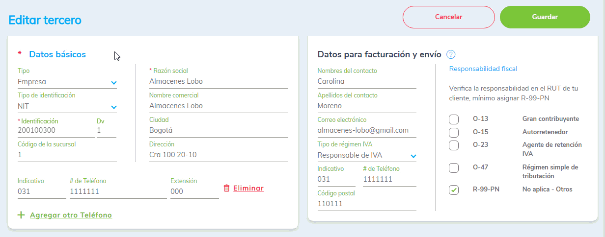 En esta pantalla, confirmas que el Tipo de identificación y el Dígito de verificación estén correctos y guardas los cambios dando clic en Guardar