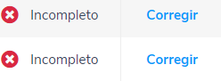 Cuando un documento presenta inconsistencias o campos sin diligenciar, el sistema mostrará el estado “incompleto”, junto con la acción “corregir”. Al hacer clic en esta opción, se desplegará una ventana que indica específicamente dónde se encuentra la inconsistencia y qué campos ya han sido completados correctamente.