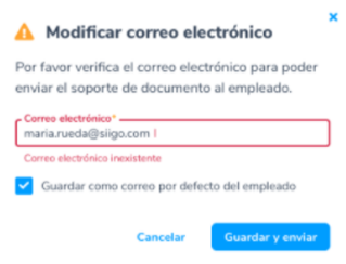 Importante: si el estado de envío aparece como fallido, tendrás la opción de reenviarlo o corregirlo; al seleccionar Corregir, se abrirá una ventana que te permitirá modificar el correo electrónico registrado en el perfil del empleado, o bien reenviar la información directamente a otro correo al que el empleado tenga acceso. Esto garantiza que los documentos lleguen al destinatario.